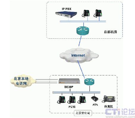 如上圖所示,通過SE30P的內(nèi)置FXO接口,可以實現(xiàn)與北京PSTN網(wǎng)絡(luò)的互聯(lián),解決北京分公司與中國用戶的通信;通過SE30P的IP中繼方式,實現(xiàn)與總部的IP PBX互聯(lián),變國際長途為內(nèi)部通話,為公司節(jié)省了大量辦公費用;公司內(nèi)部使用IP話機作為人工總機和分機,并通過ATA實現(xiàn)傳真接入。