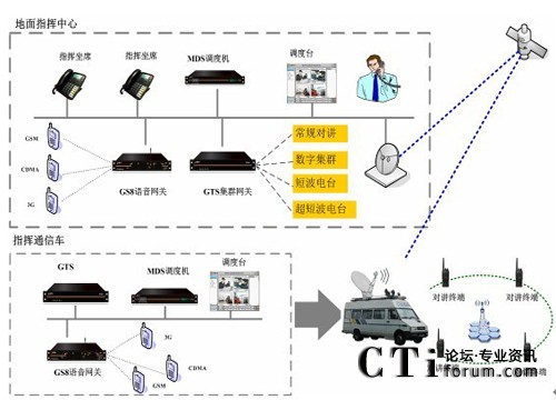 整體系統(tǒng)由地面指揮中心和指揮通信車組成,指揮中心和通信車分別部署調度臺,均可指揮現(xiàn)場。地面指揮中心和指揮通信車通過部署衛(wèi)星設備,通過衛(wèi)星鏈路進行通信,當衛(wèi)星鏈路出現(xiàn)故障時,指揮車也可通過移動網(wǎng)絡(GSM/CDMA/3G)與地面指揮中心互聯(lián)互通。