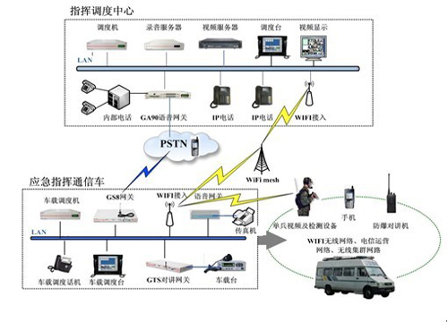 相對,應(yīng)急指揮車配有車載Wi-Fi基站,接入園區(qū)內(nèi)鋪設(shè)的無線寬帶網(wǎng)絡(luò),在園區(qū)無線寬帶覆蓋范圍內(nèi)實現(xiàn)與指揮中心的語音、視頻、數(shù)據(jù)的雙向傳輸。當(dāng)Wi-Fi mesh網(wǎng)絡(luò)無信號覆蓋,指揮車還可通過2G\3G、無線集群等方式與指揮中心進行多網(wǎng)融合語音通信。