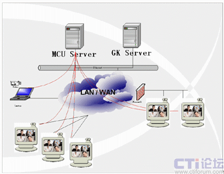 當(dāng)召開多點(diǎn)的交互式會議時(shí)則需要MCU(多點(diǎn)控制器)的參與。MCU的作用類似于交換機(jī),主要完成各會場圖像的切換和語音的混音功能,一般放置在主會場。在MCU的控制下可以實(shí)現(xiàn)語音激勵、導(dǎo)演控制等多種會議控制方式。