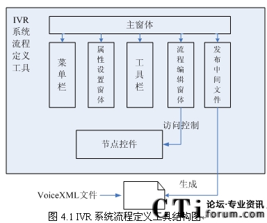 從圖4.4所示結(jié)構(gòu)中,通過主窗體可以訪問其它窗體操作,同時(shí)控制窗體與類模塊的信息交互。系統(tǒng)中的各個(gè)窗口的實(shí)現(xiàn)均是基于基礎(chǔ)類包的。下面詳細(xì)介紹IVR系統(tǒng)流程工具各個(gè)部分的實(shí)現(xiàn)。其實(shí)現(xiàn)工具的內(nèi)容詳見文獻(xiàn)[31]。