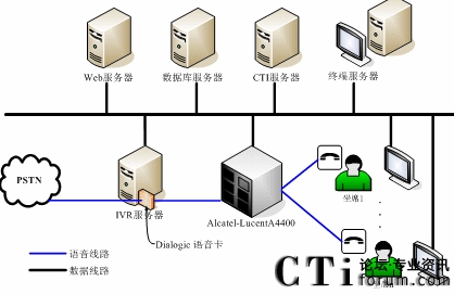 整個(gè)呼叫中心分存在兩種通訊方式:語(yǔ)音方式和數(shù)據(jù)方式。語(yǔ)音方式指的是傳統(tǒng)的電話(huà)線(xiàn)路,數(shù)據(jù)方式則是指的是各個(gè)應(yīng)用程序間的通訊交互線(xiàn)路。管理語(yǔ)音硬件的有Dialogic語(yǔ)音卡—負(fù)責(zé)整個(gè)系統(tǒng)的語(yǔ)音接入,并處理自動(dòng)語(yǔ)音的相關(guān)動(dòng)作;Alcatel-lucent