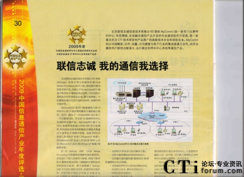 CTI論壇(ctiforum)11月24日消息(記者 張塵):日前,在中國計(jì)算機(jī)報(bào)社開展了2009年度中國信息通信產(chǎn)業(yè)年度獎(jiǎng)項(xiàng)評選活動,北京聯(lián)信志誠信息技術(shù)有限公司(簡稱“MyComm公司”)憑借領(lǐng)先的IP語音通信技術(shù)優(yōu)勢,以其長久以來業(yè)界口碑和今年所取得優(yōu)秀業(yè)績,榮獲2009年度中國信息通信呼叫中心領(lǐng)域領(lǐng)軍企業(yè)獎(jiǎng)和2009年度中國信息通信IP呼叫中心優(yōu)秀創(chuàng)新產(chǎn)品獎(jiǎng)。