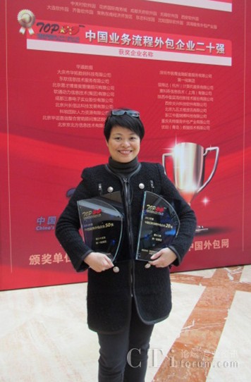 在2012中國服務(wù)外包領(lǐng)軍者年會的頒獎典禮上,第一線集團(tuán)華北區(qū)總經(jīng)理陳施慧女士上臺領(lǐng)取了這兩個(gè)獎項(xiàng)。