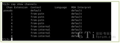 上面的輸出表示A1200P的通道都已識(shí)別,驅(qū)動(dòng)安裝成功(本文用的是8個(gè)FXS口,上面的channel 01到channel 08是FXs口,后面的FXO表示它們使用的是FXO的信令,并不是表示它們是FXO口,這一點(diǎn)大家應(yīng)該注意)