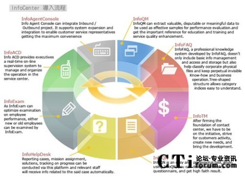 由于今日的客服中心已是多媒體的客服中心,不再只有單純的電話進線,客戶尋求服務的管道更多樣化,InfoCenter Total Solution可以完全整合應用程序、數(shù)據(jù)倉儲系統(tǒng)、多媒體溝通互動管道,藉由不同的系統(tǒng)達到分析與處理客戶需求,并且達到一致性的工作流程管理,提供更高質量的服務。