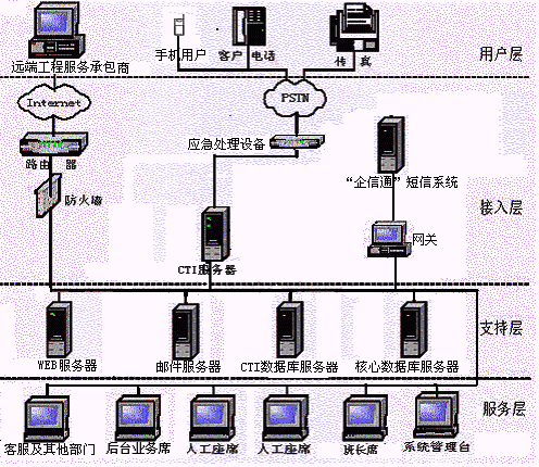 寬帶信息公司目前已建立了完善的客戶資料管理體系,能夠受理客戶客戶的業(yè)務(wù)受理、咨詢、投訴建議等,并有自己的郵件服務(wù)器和"企信通"短信服務(wù)器,因此,應(yīng)當(dāng)充分利用公司已有的系統(tǒng)設(shè)備,綜合公司實(shí)際的業(yè)務(wù)管理需要,客戶服務(wù)中心的熱線系統(tǒng)采用C/S三層體系結(jié)構(gòu),而后臺(tái)、客戶服務(wù)部門及其他部門之間的采用B/S體系結(jié)構(gòu),實(shí)現(xiàn)投訴事件在公司內(nèi)部各部門的傳遞、跟蹤管理,從而整合公司各部門資源為用戶及時(shí)周到的提供全程服務(wù)。