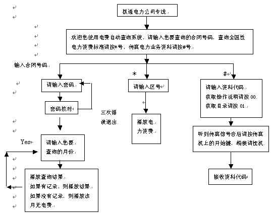 。。當(dāng)用戶得知需要繳納電費(fèi)時(shí),可撥打電力公司查詢熱線,聽到問候語后輸入合同號(hào)碼,系統(tǒng)即可自動(dòng)播放用戶查詢?cè)路莸碾娰M(fèi)發(fā)生情況。