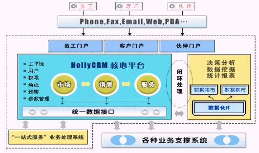 更關(guān)鍵是,HOLLYCRM(合力金橋軟件)的CRM不是單純的、簡(jiǎn)單的客戶管理產(chǎn)品,它是一套完整的解決方案,覆蓋了協(xié)作型、運(yùn)營(yíng)型和分析型的全部范疇,其結(jié)構(gòu)框架見(jiàn)圖,其核心平臺(tái)涉及到市場(chǎng)、銷售、服務(wù)等多個(gè)環(huán)節(jié),并通過(guò)數(shù)據(jù)集市或者數(shù)據(jù)倉(cāng)庫(kù)的形式,提供數(shù)據(jù)挖掘、決策分析等服務(wù)。最關(guān)鍵的是,HOLLYCRM(合力金橋軟件)在提供解決方案外,還不斷提升管理和咨詢能力,和一些咨詢公司合作,將咨詢和產(chǎn)品作為一個(gè)整合的方案提供給用戶,并提供360度的系統(tǒng)咨詢、設(shè)計(jì)和實(shí)施、維護(hù)服務(wù)。