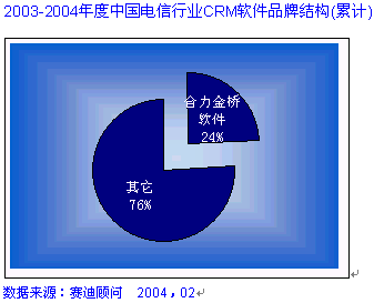 HOLLYCRM(合力金橋軟件)公司作為實力卓越的CRM主流廠商, 致力于提供最專業(yè)化的應用軟件和服務,提供以客戶為核心的信息化解決方案,服務領域跨越電信運營商、金融業(yè)、制造業(yè)等行業(yè)。在電信行業(yè)的CRM市場中,合力金橋軟件處于穩(wěn)固領先位置, 其推出的客戶關系管理解決方案,覆蓋協(xié)作型、運營型和分析型的全部范疇。在CRM產(chǎn)業(yè)在2003年的中國發(fā)展態(tài)勢整體放緩的大環(huán)境下, HOLLYCRM卻一枝獨秀, 在不到一年的時間里簽下中國網(wǎng)通總部、天津網(wǎng)通、山西網(wǎng)通、內(nèi)蒙聯(lián)通等大型CRM項目,積累了豐富的CRM項目實施經(jīng)驗。在累計的電信行業(yè)CRM軟件市場中,合力金橋軟件一家占有份額就達到24%, 合力金橋軟件此次在CCID年度研究報告中倍受矚目可謂眾望所歸, 充分說明了其CRM產(chǎn)品在高端行業(yè)的領軍地位, 如圖: