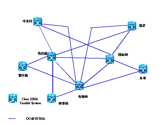 北京電信公眾IP網的骨干節(jié)點構成的骨干網拓撲情況如圖: