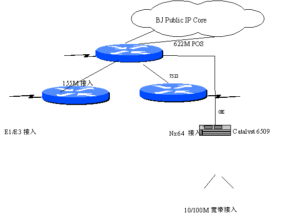 北京電信公眾IP網中,骨干網核心節(jié)點路由器為業(yè)界最 先進的新一代電信級高性能的路由交換機 Cisco GSR 12016太比特系統(tǒng); 邊緣節(jié)點路由器為GSR 12008,Cisco 7513;10/100M局域網接入設備為Catalyst 6509交換機。