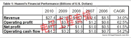 華為已經(jīng)取得了強(qiáng)大的地位,國內(nèi)外銷售均快速增長。該公司過去四年?duì)I業(yè)收入增長了兩倍以上,2010年?duì)I業(yè)收入從2006年的85億美元上升到274億美元。