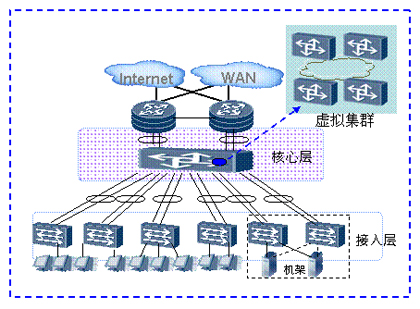 如上圖所示,整個數(shù)據(jù)中心網(wǎng)絡(luò)通過虛擬集群技術(shù),多個核心層設(shè)備虛擬為一臺設(shè)備。通過增加核心節(jié)點,提供無阻塞的網(wǎng)絡(luò)能力,接入更多服務(wù)器。服務(wù)器的規(guī)模可以從3000臺“無級擴(kuò)展”到數(shù)萬臺。在滿足企業(yè)日益增長的業(yè)務(wù)需求的同時,并不增加網(wǎng)絡(luò)的復(fù)雜度,減少管理和維護(hù)的成本。