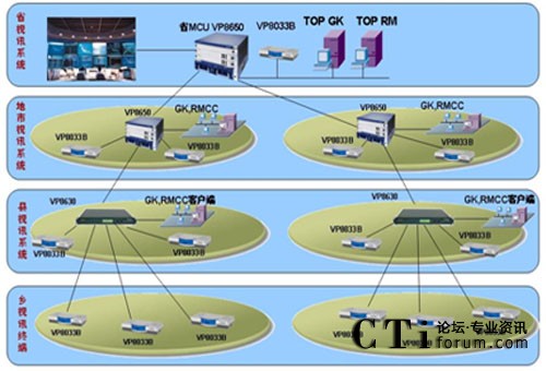 這是目前國內(nèi)最大的政府應(yīng)急視頻會(huì)議指揮系統(tǒng),現(xiàn)網(wǎng)可以借鑒的經(jīng)驗(yàn)很少,華為公司充分意識到該項(xiàng)目的重大意義,投入大量人力物力進(jìn)行網(wǎng)絡(luò)環(huán)境調(diào)研和客戶需求分析,經(jīng)過眾多專家和工程人員的反復(fù)論證,最終該套系統(tǒng)采取了分布式三級級聯(lián)組網(wǎng)結(jié)構(gòu)和四級分級分權(quán)管理模式,具有強(qiáng)大的備份能力和豐富的功能特性,在省和9個(gè)地市分別配置1臺8650MCU和1套管理軟件,在58個(gè)縣分別配置1臺8630 MCU,在1205個(gè)會(huì)議室分別配置1臺8033B終端。