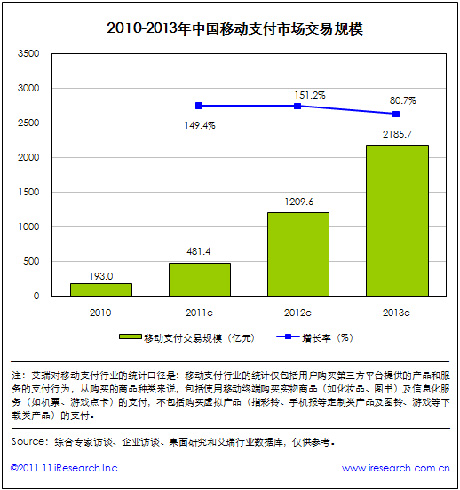 艾瑞咨詢(xún)近期推出《2011年中國(guó)移動(dòng)支付行業(yè)研究報(bào)告》,針對(duì)中國(guó)移動(dòng)支付市場(chǎng)現(xiàn)狀進(jìn)行了深入的探討。報(bào)告研究數(shù)據(jù)顯示,2011年中國(guó)移動(dòng)支付市場(chǎng)交易規(guī)模將達(dá)到481.4億元,同比增長(zhǎng)149.4%。以下截取報(bào)告觀(guān)點(diǎn)進(jìn)行詳細(xì)解讀: