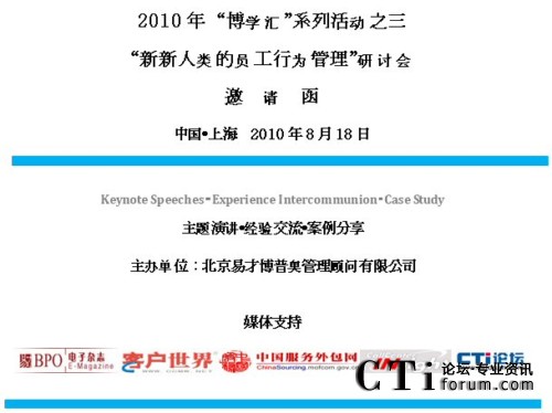 21世紀(jì)什么是貴?人才最貴!人才是企業(yè)持續(xù)發(fā)展的唯一生命之源。易才博普奧公司(CTG BPO)作為專業(yè)的人力資源外包專家、服務(wù)外包產(chǎn)業(yè)專業(yè)人才租賃供應(yīng)商,近年來在業(yè)界積累了大量優(yōu)秀的一線人才租賃經(jīng)驗(yàn)并得到廣泛的業(yè)界好評!2010年伊始,易才博普奧推出了“博學(xué)匯”系列客戶交流會活動(dòng),旨在搭建一個(gè)與行業(yè)精英、業(yè)內(nèi)專家互動(dòng)交流的平臺,學(xué)習(xí)、體驗(yàn)和分享多元文化,促進(jìn)和推動(dòng)彼此之間的交流與合作。