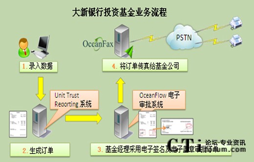 大新銀行采用OceanFax傳真服務器收發(fā)電子傳真,并將OceanFax與Unit Trust Reporting 系統(tǒng)及OceanFlow電子審批系統(tǒng)整合,理順投資基金流程,包括訂單生成、審批及傳真發(fā)送,實現(xiàn)完美自動流程,提高效率、降低成本及保證信息安全。