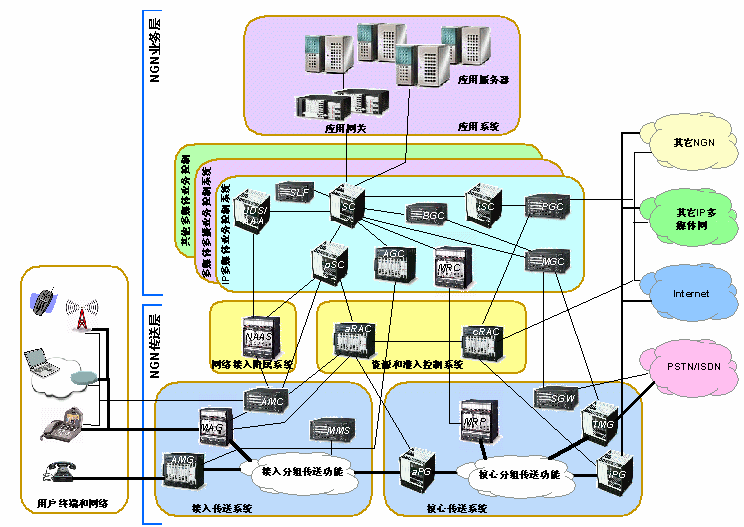 NGN網(wǎng)絡(luò)邏輯上可分為用戶(hù)網(wǎng)、接入網(wǎng)和核心網(wǎng)。網(wǎng)絡(luò)的管理界限將NGN劃分為一些不同的NGN域。接入網(wǎng)和核心網(wǎng)可在同一NGN域中,也可以屬于不同的域。域內(nèi)的網(wǎng)絡(luò)拓?fù)湫畔⒖梢詫?duì)外屏蔽。域和域之間的互通將通過(guò)網(wǎng)關(guān)來(lái)完成。NGN支持與現(xiàn)有的網(wǎng)絡(luò)互通,如電話(huà)網(wǎng)絡(luò)、蜂窩網(wǎng)絡(luò)、互聯(lián)網(wǎng)等。NGN還支持各種有"NGN意識(shí)"的用戶(hù)設(shè)備和現(xiàn)有的無(wú)"NGN意識(shí)"的終端,如模擬電話(huà)機(jī)、傳真機(jī)、ISDN終端等。這些互通都通過(guò)網(wǎng)關(guān)來(lái)完成。NGN的網(wǎng)關(guān)主要包括多媒體接入網(wǎng)關(guān)、接入媒體網(wǎng)關(guān)、中繼媒體網(wǎng)關(guān)、分組網(wǎng)關(guān)和信令網(wǎng)關(guān)。