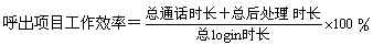 - 定義:呼出項目的工作效率是衡量呼出項目座席工作負(fù)荷率的主要KPI,一般指某段統(tǒng)計時間內(nèi),總處理時長與登錄系統(tǒng)時長的比率。對于沒有座席操作系統(tǒng)的呼叫中心可以將分母換成計劃工作時長。
