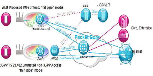 上述方案解決了WiFi分流的認(rèn)證問題,上海貝爾的方案中,將WLAN的GW功能引入到7750 SR業(yè)務(wù)路由器上,該功能通過7750 SR上的AA-ISA多業(yè)務(wù)板卡實現(xiàn)。WiFi分流為確保安全性,在3GPP TS 23.402中,對WiFi終端的接入,采取了一種所謂瘦管道的模式,即要從用戶端向網(wǎng)關(guān)發(fā)起IP-Sec連接,而AP僅充當(dāng)橋的作用,對于PC或平板電腦等終端,這不是什么問題,但對于手機而言,IP-Sec將帶來非常大的負(fù)荷,不僅影響終端上應(yīng)用的相應(yīng)速度,同時對電池的消耗非常之大,就目前情況看,市場上支持該功能的手機非常少。上海貝爾的方案中,采用了胖管道的模式,通過從AP向網(wǎng)關(guān)建立IP-Sec或GRE隧道,顯著降低了對移動終端的要求,不僅使得移動終端的成本得以下降,同時延長了終端的使用時間,更重要的是,擴大了運營商推廣WiFi 分流方案的適用群體。