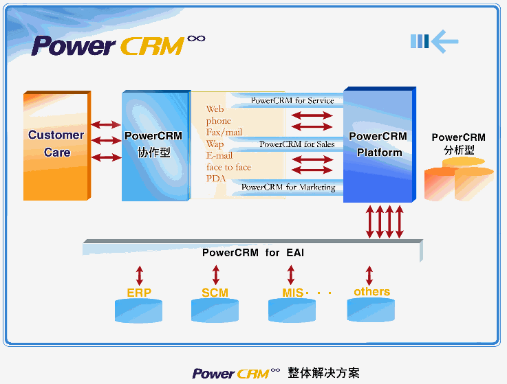 創(chuàng)智集團(tuán)投入巨資,推出的PowerCRM是一套完全基于WEB方案的企業(yè)級的客戶關(guān)系管理應(yīng)用系統(tǒng)。是中國第一款自主開發(fā)的具有大容量數(shù)據(jù)處理能力,具有大型系統(tǒng)定制能力,針對中高端用戶、大型企業(yè)(通信行業(yè)、金融、證券、保險行業(yè)、制造業(yè)、零售業(yè)、服務(wù)行業(yè)、顧問咨詢行業(yè)、IT行業(yè)等)解決方案,是國家計(jì)委高技術(shù)產(chǎn)業(yè)化示范工程。盡管已有不少國內(nèi)軟件廠商紛紛推出自己的CRM,但僅停留在“入門級”水平,只能為中小企業(yè)提供傳統(tǒng)的、以運(yùn)營型為主的CRM解決方案,雖然也可以幫助企業(yè)用戶處理好客戶關(guān)系,提高工作效率,但難以帶來贏利。PowerCRM將自己主要的競爭對手定位于Siebel, Oracle等知名的國際級公司的產(chǎn)品。同過不斷地優(yōu)化產(chǎn)品設(shè)計(jì),爭取奉獻(xiàn)給國內(nèi)企業(yè)客戶功能最強(qiáng)大,性能價格比最高,最符合中國企業(yè)特色的CRM產(chǎn)品。