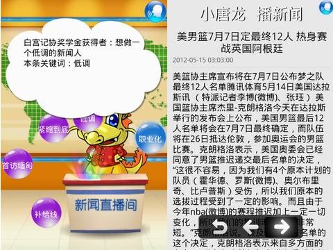 CTI論壇(ctiforum)5月17日消息(記者 歐陽): 2012年5月9日,中國第一個全方位智能交互手機助手“小唐龍”正式上線,小唐龍是一個基于Android系統(tǒng)的智能手機助手,它可隨時隨地幫助手機用戶進行聊天、歌曲點播、聽新聞、地圖導(dǎo)航、互聯(lián)網(wǎng)信息查詢等多方面服務(wù),其中《唐龍新聞》以新穎獨特成為小唐龍的閃亮點。當拿起手機對著“小唐龍”說,“聽新聞”,“小唐龍”的播報便即刻開始——天下大事早知道,由我唐龍給您報,我們來看今天的唐龍新聞。