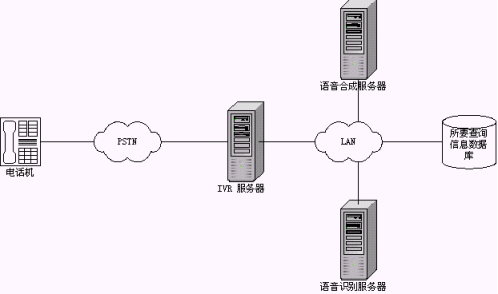 這種模式是最常見的一種接入情況。將原有煩瑣的按鍵式提示改成更具人性化的交談式語音交互,類似于語音門戶模式。這是目前大家普遍認同的一種語音識別技術應用方式。相比原有的按鍵方式,系統(tǒng)的新穎程度、個性化程度、用戶操作的方便程度等都得到了極大的提高,如語音識別技術在股票查詢中的成功應用,在點歌系統(tǒng)中的成功應用等;另外利用語音識別技術也解決了一些原有系統(tǒng)無法實現的技術難題,如火車時刻查詢、機場航班查詢等,原有系統(tǒng)借助郵政編碼、電話區(qū)號等的方式讓人無所適從,現在直接和系統(tǒng)交談,順利獲取所需信息,可以說是語音識別技術一個成功的應用。這種系統(tǒng)的拓撲結構如下圖示: