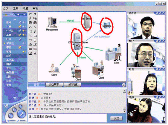 V2 Conference可以利用普通的PC機、標準的視頻攝像頭、耳機和麥克風(fēng),通過Internet或者是局域網(wǎng)進行會議。與傳統(tǒng)的需要專用的服務(wù)器和硬件支持的視頻會議相比,企業(yè)無需投入高昂的成本,就可以實現(xiàn)高質(zhì)量的遠程會議。同時,V2 Conference還提供了遠程會議管理的功能。