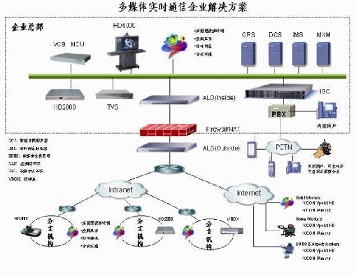 VCON提供了以HD系列的視頻終端產(chǎn)品和以VCB系列的多點(diǎn)控制單元(MCU)產(chǎn)品來構(gòu)建基于IP網(wǎng)絡(luò),采用H.323協(xié)議作為標(biāo)準(zhǔn)協(xié)議的視頻通信解決方案。通常主會場選擇會議室型終端HD5000,該終端在64Kbit/s下就可以實(shí)現(xiàn)畫面流暢的動態(tài)雙流;主會場也可以選擇機(jī)架式會議終端HD2000,這樣主會場可以選配正裝和吊裝攝像機(jī),拍攝會場不同角度的場景;多點(diǎn)控制單元(MCU)選擇VCB3000,同時可以為領(lǐng)導(dǎo)、個人桌面或者出差用戶單獨(dú)配置支持H.323標(biāo)準(zhǔn)的Vpoint HD軟終端,該終端是目前業(yè)界惟一支持H.264、雙流、組播接受以及遠(yuǎn)程控制的軟終端產(chǎn)品。