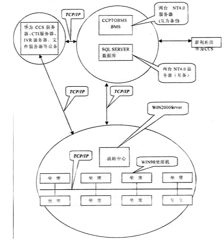 系統(tǒng)采用總部集中模式,前臺運行信雅達通訊轉(zhuǎn)接程序(CCPTOBMS)和信雅達業(yè)務(wù)處理程序(BMS)。通訊轉(zhuǎn)接程序從華為接入平臺接收各類業(yè)務(wù)請求,再轉(zhuǎn)發(fā)至業(yè)務(wù)處理程序。業(yè)務(wù)處理程序與新利處理中心通訊,將各類業(yè)務(wù)請求分類處理。后臺數(shù)據(jù)庫選用兩臺服務(wù)器安裝SQLSERVER7.0,使用OCTOPUS進行數(shù)據(jù)備份。