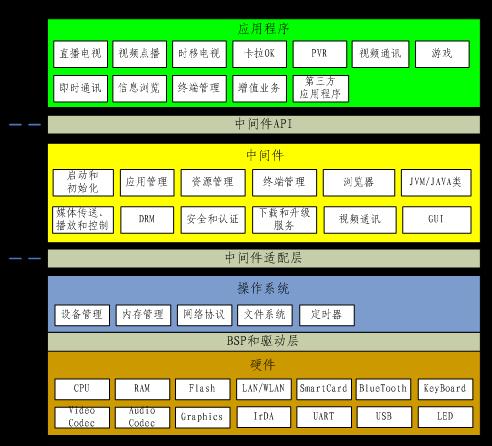 第三個(gè)中間件的可移植性可擴(kuò)展性。芯片廠家或第三方廠家提供的解決方案主要包括:硬件解決方案;實(shí)時(shí)操作系統(tǒng)層,包括了設(shè)備/網(wǎng)絡(luò)驅(qū)動(dòng)、文件系統(tǒng)、圖形/字體驅(qū)動(dòng)、網(wǎng)絡(luò)協(xié)議;瀏覽器模塊,其他模塊需要機(jī)頂盒制造廠家進(jìn)行研發(fā),而這些正是競爭差異和難度所在。產(chǎn)業(yè)要做大,就需要更多的廠家進(jìn)入。理想的中間件客戶端基于操作系統(tǒng)層和硬件;使得更多的缺乏固網(wǎng)技術(shù)經(jīng)驗(yàn)的廠家能夠加入到機(jī)頂盒產(chǎn)業(yè)鏈中,專注于機(jī)頂盒基礎(chǔ)研發(fā)和生產(chǎn),使得中間件移植的難度最小、時(shí)間最短