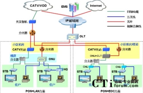 當(dāng)然,三網(wǎng)融合不僅僅體現(xiàn)在網(wǎng)絡(luò)層面,更多的還體現(xiàn)在業(yè)務(wù)層面。PON+EoC方案實(shí)施后,廣電原有的單向HFC網(wǎng)絡(luò)發(fā)生了根本的變化,不僅能為交互機(jī)頂盒提供回傳通道,而且能夠?qū)崿F(xiàn)多種寬帶業(yè)務(wù)提供,可以方便的開(kāi)展電視直播、電視點(diǎn)播、時(shí)移電視、互動(dòng)電視、互動(dòng)游戲、互動(dòng)教育、互動(dòng)醫(yī)療、在線(xiàn)廣告、全球眼,網(wǎng)絡(luò)視頻監(jiān)控、影音博客、卡拉OK、VPN、VOIP、多媒體會(huì)議、即時(shí)通信、家庭寬帶、企業(yè)寬帶、商業(yè)寬帶、無(wú)線(xiàn)覆蓋、互聯(lián)網(wǎng)專(zhuān)線(xiàn)、城域網(wǎng)專(zhuān)線(xiàn)、企業(yè)郵箱等各種業(yè)務(wù),為用戶(hù)提供嶄新的互動(dòng)娛樂(lè)方式和生活體驗(yàn),為企業(yè)、商戶(hù)提供全面的服務(wù)。