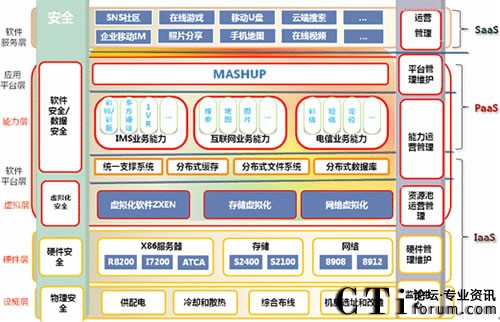 軟件服務層主要是對用戶提供具體的服務,比如SNS社區(qū)、移動U盤、企業(yè)移動IM等。同時,中興云計算架構還提供多層次安全解決方案和管理方案。