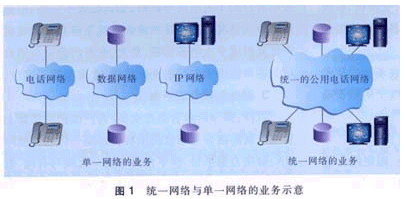 。1)數(shù)據(jù)和話音的融合進一步促進電話網(wǎng)絡(luò)、數(shù)據(jù)網(wǎng)絡(luò)與IP網(wǎng)絡(luò)的融合。一個統(tǒng)一的網(wǎng)絡(luò)提供各類業(yè)務顯然比各類網(wǎng)絡(luò)提供各自的業(yè)務要大大提高運營和服務的效率,如圖1所示。
