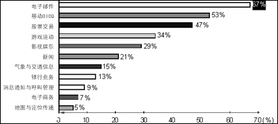 到底有多少人需要移動數(shù)據(jù)業(yè)務(wù)呢?有資料顯示,當(dāng)前有36%的人對移動數(shù)據(jù)業(yè)務(wù)處于觀望狀態(tài),只要移動數(shù)據(jù)業(yè)務(wù)發(fā)展得好,他們肯定會加入進(jìn)來。我們相信,現(xiàn)在已經(jīng)有一定比例的人開始從觀望狀態(tài)加入使用移動數(shù)據(jù)業(yè)務(wù)的行列中來。如圖2所示,在用戶需求中,電子郵件占67%,娛樂性的業(yè)務(wù)也占有較高的比例,新聞、信息類其次。這些數(shù)據(jù)說明,人們使用移動數(shù)據(jù)業(yè)務(wù),大部分的習(xí)慣是沿襲互聯(lián)網(wǎng)的,這也為移動網(wǎng)絡(luò)與互聯(lián)網(wǎng)的結(jié)合奠定了用戶基礎(chǔ)。