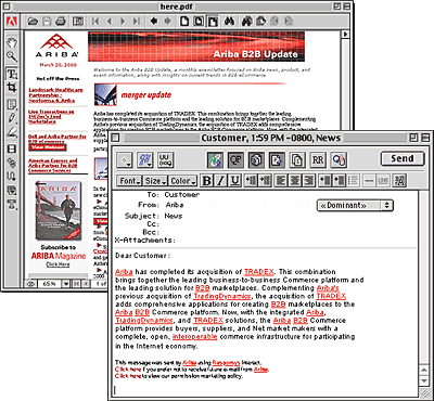 。。但由于PDF 能精確地保持公司本身特征的外觀與感覺 -- 包括標(biāo)識語,服務(wù)類型和顏色--商家以PDF格式的業(yè)務(wù)信息作為附件e-mail給顧客,這樣顯得非常醒目。而且由于Web鏈接能直接嵌入文章,顧客能從一封e-mail直接跳到一個Web站點,從中獲得關(guān)于產(chǎn)品或特價商品的信息。