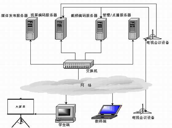當(dāng)老師端在異地時(shí)(攝像頭離服務(wù)器較遠(yuǎn),無(wú)法物理連接),可通過(guò)“電視會(huì)議系統(tǒng)”將老師的圖像及聲音實(shí)時(shí)傳送到編碼服務(wù)器,桌面課件可以通過(guò)PcAnywhere傳送到編碼服務(wù)器。圖像,聲音和桌面課件通過(guò)Web Streaming采集壓縮并在網(wǎng)上實(shí)時(shí)廣播。這種系統(tǒng)架構(gòu)也是當(dāng)今功能比較齊全和完善的一種實(shí)現(xiàn)方式。