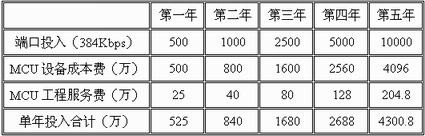 中國網(wǎng)通CNC視訊運(yùn)營網(wǎng)絡(luò)在建網(wǎng)成本上主要考慮四個(gè)部分。一是視訊交換平臺(tái)MCU部分,主要用于多點(diǎn)視頻通信;二是視訊運(yùn)營支撐系統(tǒng),包括各種運(yùn)營所必須的軟件(網(wǎng)管、業(yè)務(wù)受理中心、業(yè)務(wù)管理中心)及相應(yīng)的硬件服務(wù)器;三是 H.323 視訊系統(tǒng)的關(guān)鍵組件GK軟件及相應(yīng)硬件服務(wù)器,其容量和個(gè)人視頻通信業(yè)務(wù)的發(fā)展情況息息相關(guān);四是投入資金利息。具體可細(xì)分如下: