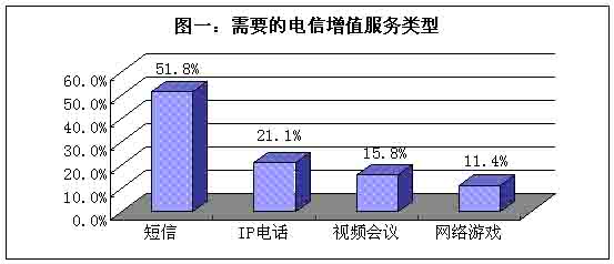 在圖一中,除短信外的IP電話、視頻會議和網(wǎng)絡(luò)游戲的百分比差距不大,這說明這幾個市場將接踵而至,而且規(guī)模漸現(xiàn)。事實(shí)也證明今年是電信增值服務(wù)開始收獲的一年,先是移動市場上短信的紅火,隨之而來的是固話市場上IP電話的風(fēng)靡。由于打長途電話可以節(jié)省70%的話費(fèi),今年年初以來IP超市、IP面值卡、IP主叫、IP專線等業(yè)務(wù)都獲得長足發(fā)展。隨后是視頻會議,今年也獲得突破性進(jìn)展。在9月末的北京視頻會議論壇上人們可以看到品種豐富并且全面商用的視頻設(shè)備。視頻會議的發(fā)展無疑一方面基于逐步完善的運(yùn)營網(wǎng)絡(luò),另一方面受到“非典”的拉動。