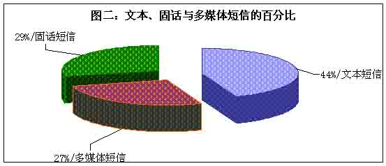 目前市場的主流短信主要有三大類,即傳統(tǒng)的手機(jī)文本短信、流行的圖音文字兼?zhèn)涞摹安市拧焙托峦瞥龅墓淘挾绦拧U麄短信市場確實(shí)火了,但是在火爆的背后哪一種短信是真正的巨無霸?調(diào)查表明,在三類短信之中,選擇文本類短信的用戶最多,占據(jù)44%,其次是固話短信,再次是多媒體短信,即俗稱的“彩信”,選擇固話短信和彩信的百分比十分接近。(見圖二)看來,“巨無霸”非文本類短信莫屬。