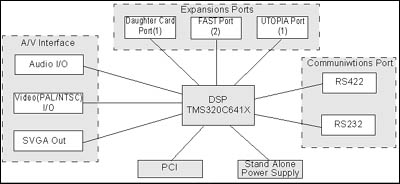 ATEME公司開發(fā)的NVDK板,基于TI公司的TMS320C64系列DSP,板上DSP為TMS320C6415或TMS320C6416,工作頻率600MHz。體系結(jié)構(gòu)圖如左: