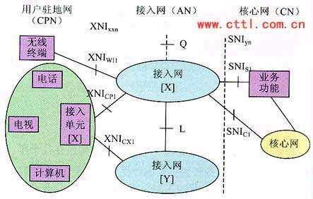 在圖中,XNI為接入網(wǎng)與用戶駐地網(wǎng)的接口,SNI為接入網(wǎng)到核心網(wǎng)之間的接口,L參考點為不同接入網(wǎng)之間的接口參考點。下一代的接入網(wǎng)應綜合利用多種手段在XNI和SNI之間提供有質(zhì)量保證的基于分組的寬帶的傳送承載能力。下一代網(wǎng)絡(luò)的接入網(wǎng)應具有以下特點: