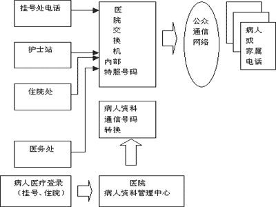 病人資料數(shù)據(jù)庫(kù)保存的病人資料均與病人住院、就診代號(hào)對(duì)應(yīng),醫(yī)護(hù)人員因工作需要欲與病人或家屬聯(lián)系時(shí),使用本部門(mén)的電話(huà)通過(guò)呼叫中心獲得使用權(quán)限。交換機(jī)給醫(yī)院內(nèi)部指定一個(gè)"特服號(hào)碼",負(fù)責(zé)與病人通信。