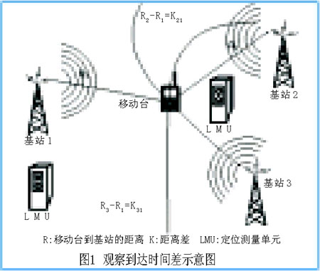 觀察到達時間差(OTDOA)是通過測量電波從發(fā)射機傳播到多個接收機的傳播時間差來確定目標移動臺的位置。初步測量通過UE接收的下行鏈路公共導頻信道的到達時間差實現(xiàn)。3個基站形成的平面上,一點到兩個固定點的距離差如為定值時,該點必定在一條雙曲線上,兩條這樣的雙曲線的交點便可得到移動臺的位置,如圖1