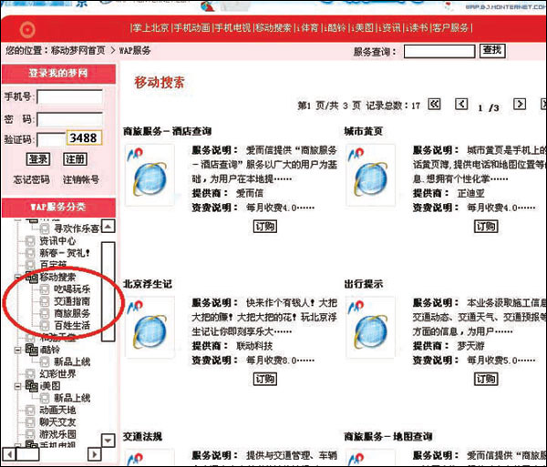 圖1 移動(dòng)運(yùn)營(yíng)商網(wǎng)站上列出的移動(dòng)搜索業(yè)務(wù)分類(lèi)