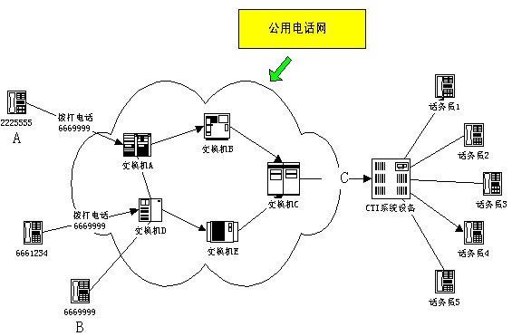 - CTI系統(tǒng)的將以企業(yè)(B)的名義對客戶(A)進行接續(xù)服務,該服務可以是語音服務,傳真服務,人工服務,可以是客戶定制的語音系統(tǒng),傳真服務系統(tǒng),會議系統(tǒng),技術支持系統(tǒng)等等。