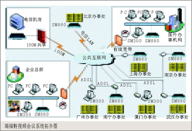 。。本系統(tǒng)中包含多個(gè)會(huì)場,使用瑞福特SM 880硬件終端,每個(gè)會(huì)場采用單獨(dú)的ADSL接入(也可采用其他接入方式),能夠保證發(fā)送與接收320×240、25