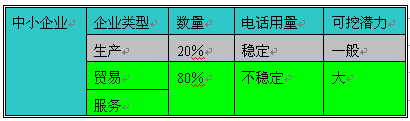 為什么大型企業(yè)可挖潛力小呢,因為大型企業(yè)的電話支出非常大,以至于被列入成本,可計算的成本,如何降低成本是大型企業(yè)要考慮的。