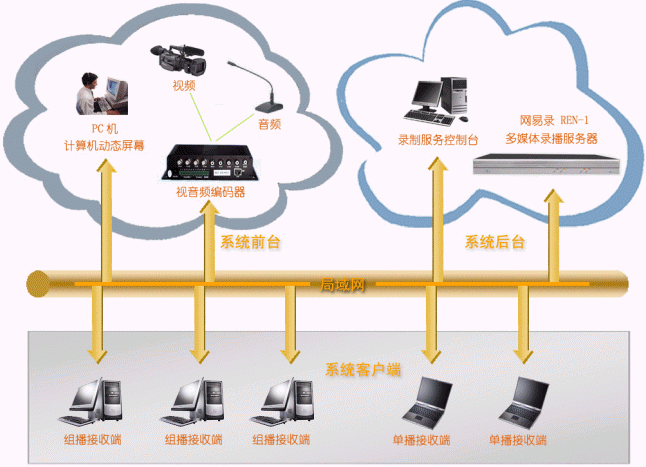 - 系統(tǒng)后臺:連接在網(wǎng)絡(luò)上即可,接受REN-1服務(wù)器管理端發(fā)送來的系統(tǒng)管理、維護(hù)指令,并負(fù)責(zé)將系統(tǒng)前臺發(fā)送來的視頻、音頻、計(jì)算機(jī)動(dòng)態(tài)屏幕進(jìn)行實(shí)時(shí)錄制和直播,它包括:網(wǎng)易錄媒體中心(REN-1),它為系統(tǒng)的核心,主要完成視頻、音頻、計(jì)算機(jī)動(dòng)態(tài)屏幕的錄制和直播;